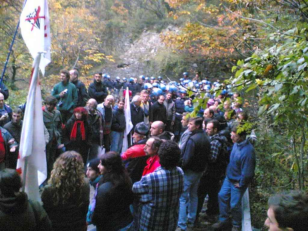 Non eravamo in molti, una ventina di persone. Avevamo scelto di anticipare i tempi rispetto all’appuntamento dato dai sindaci, per le sette del mattino, giù in basso all’entrata del paese: immaginavamo che la trivella non sarebbe arrivata da sola, ma protetta dalle truppe della repressione e sapevamo che le operazioni repressive avvengono all’alba, quando le strade sono deserte e le case ancora immerse nel sonno.