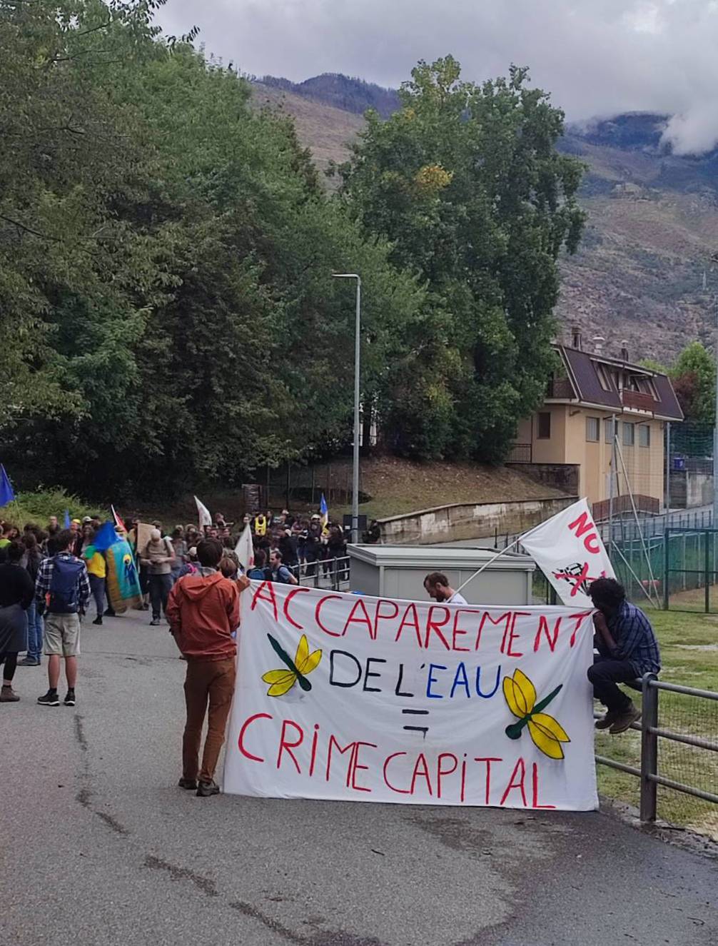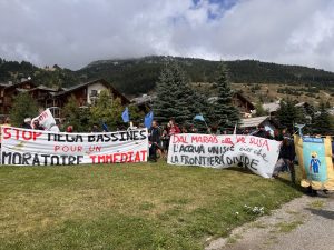 Il Movimento No Tav e quello contro i mega bacini così come i diversi collettivi impegnati nel sostegno ai migranti hanno approfittato di questo luogo per denunciare la violenza nei trattamenti riservati alle persone che fuggono dalle devastazioni delle industrie capitaliste, compreso l’accaparramento dell’acqua, per l’economia del turismo. Durante gli interventi, il collettivo Tous Migrants, ha parlato del legame che c’è tra l’accaparramento dell’acqua e il controllo poiliziesco attuato sulle persone nel biranzonese. “Mentre le persone espulse devono nascondersi, a volte rischiando la loro vita per fare valere i loro diritti, i turisti hanno un accesso privilegiato all’utilizzo e allo sfruttamento del nostro territorio. Questo è il risultato diretto di scelte politiche che si sottomettono alle sole logiche economiche, favorendo l’accaparramento delle risorse (acqua, terra etc.) e rendole inaccessibili alla maggior parte delle persone”. Le lotte per la difesa dei beni comuni non hanno frontiera.