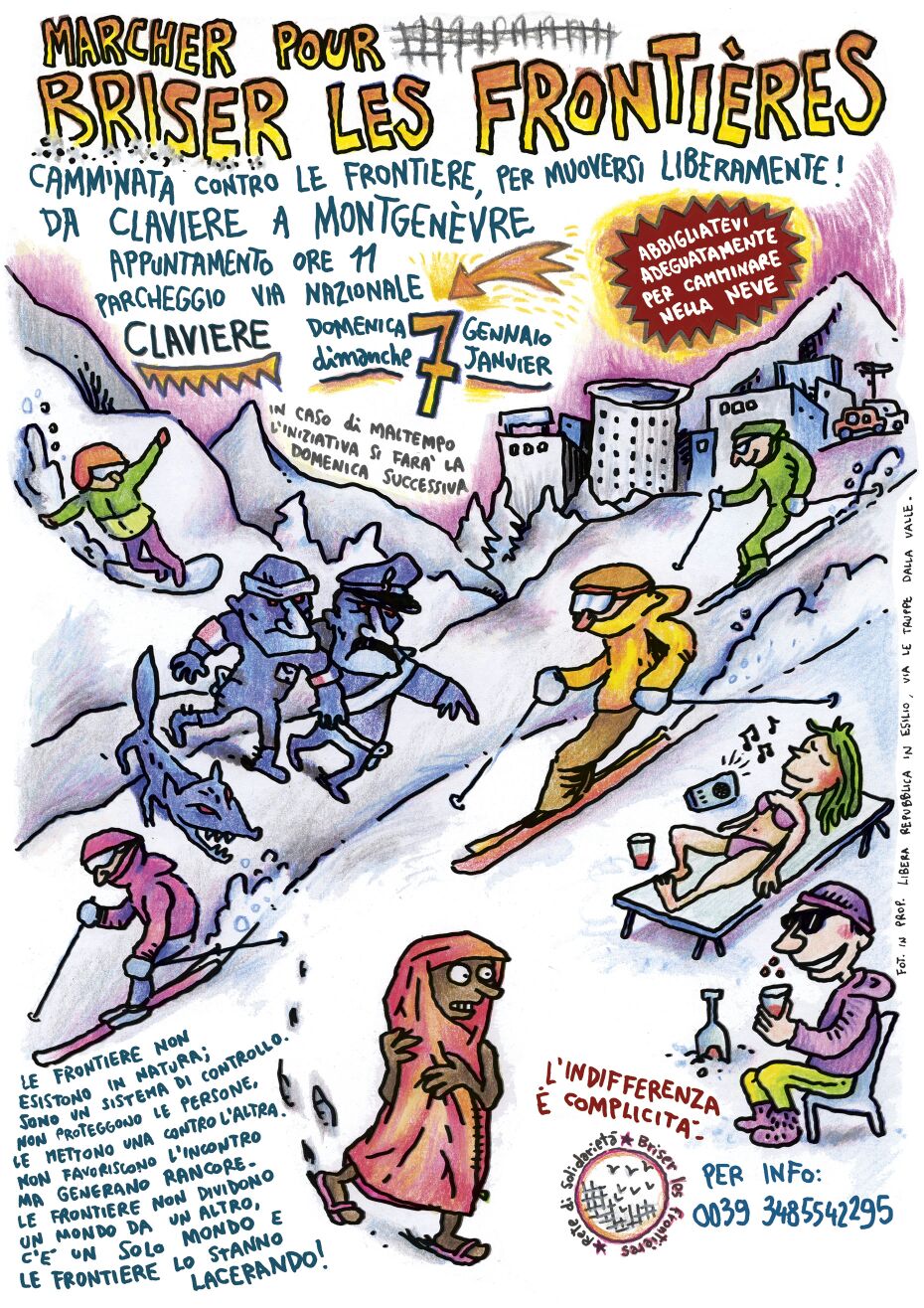 La barriera fisica delle montagne alla testata della vallata è resa selettiva dai governi, per le persone ma non per le merci. Per l’inutile e sovrastimato passaggio di queste ultime ci opponiamo come Movimento No Tav alla realizzazione di un’opera da miliardi di euro. Per il passaggio delle persone ci battiamo per la libertà di circolazione. Il Movimento No Tav è Antifascista, in quanto la nostra è una lotta contro le decisioni dall’alto che condizionano la vita delle persone ed è Antirazzista perché queste ultime devono avere eguali diritti. Scegliere dove costruirsi un futuro non deve implicare per forza intraprendere sentieri pericolosi con il rischio di morire sui nostri colli. Riteniamo inaccettabile l’utilizzo della montagna come strumento per l’arricchirsi di pochi, scavando un buco verso la Francia dall’inutilità conclamata. Allo stesso tempo rifiutiamo l’utilizzo di queste stesse montagne nel distruggere la vita delle persone che vi transitano. Per questi motivi il Movimento No Tav aderisce alla marcia del 7 Gennaio 2018 da Claviere a Montegèvre organizzata dalla Rete di Solidarietà “Briser Le Frontières”: contro le frontiere, per muoversi liberamente.