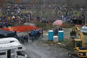 Nel tragitto verso l’interno del cantiere vengono individuate le provviste delle forze dell’ordine che vengono requisite e distribuite tra i manifestanti. L’altra parte del prato è satura di manifestanti, il prato del cantiere è completamente invaso, la forza pubblica è schiacciata nell’unico rifugio lasciatogli. Si schierano a difesa dell’ingresso principale, sono ridicoli, gli viene costruita una barricata in faccia laddove sorgeva il vecchio presidio, non sanno cosa fare, sono immobili e palesemente preoccupati.
