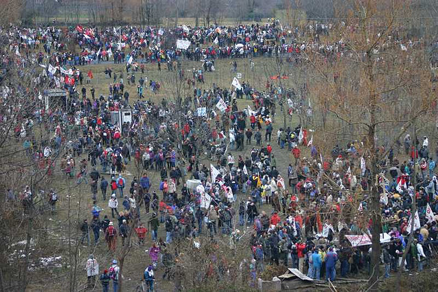 Dal furgone si continua a spiegare la situazione, “oggi siamo noi a provare a passare i blocchi, abbiamo anche noi gli scudi, spingeremo verso Venaus!”, l’intervento è accolto da applausi e grida d’incitamento, inizia la contesa, passa il container e la polizia si schiera compatta a chiudere il varco, le arieti no tav ci provano e si comincia a spingere, il contatto è determinato, la polizia carica ma non riesce ad andare oltre pochi centimetri dalla propria postazione, calci e manganelli colpiscono gli scudi e chi ne rimane fuori. Nicoletta Dosio è colpita in pieno volto da una manganellata che gli rompe il naso, la professoressa sanguina vistosamente, il corteo spinge e risponde alle cariche, volano oggetti ed è naturale che sia così. I compagni della fila di scudi sono circondati da gente che non si tira indietro, molti sono di Venaus, tutti sono lì per provarci. Non si indietreggia , la massa spinge e la colluttazione dura diversi minuti. Dalle curve sopra le collinette si scattano foto e si fanno riprese, ma soprattutto si incita a non mollare l’azione, dalla casa accanto al blocco vola qualche vaso di terracotta all’indirizzo della polizia, un anziano no tav colpisce un poliziotto con l’ombrello. E’ il momento, il corteo si divide, una parte prosegue in su verso Giaglione e si riversa giù dalla montagna per i sentieri. Tutti i punti sono buoni, inizia a nevicare quasi a rendere la coreografia della giornata di resistenza alpina perfetta, al bivio dei Passeggeri continua il fronteggiamento ma inizia a filtrare gente dai lati dello schieramento delle forze dell’ordine che ormai allo sbaraglio si aprono sconfitte. Sono migliaia i no tav che sono già al cantiere, l’area è recintata a ferro di cavallo, il prato su cui si sono costruiti i giorni meravigliosi di resistenza sono circondati da quella rete rossa che vilmente i tecnici di CMC, passamontagna calato sul volto, protetti dalla polizia, hanno piantato nel terreno durante la notte del blitz. I manifestanti si dispongono tutt’intorno alla rete, a guardar bene sembra quasi che si aspetti il segnale del via. La discesa sotto gli osceni piloni dell’autostrada, già vergati a vernice con due scritte no tav enormi, è composta da una cascata colorata di no tav, da Giaglione scendono i furgoni e il resto della manifestazione che passa vicino alla chiesa di Venaus le cui campane, ancora una volta, scandiscono i rintocchi della lotta.