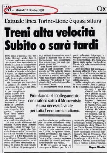 Si tratta dei medesimi spacciatori di false urgenze che nell’ottobre 1991 fecero titolare al loro organo domestico, La Stampa: «L’attuale linea Torino-Lione è quasi satura / Treni ad alta velocità subito o sarà tardi». [Sottofondo consigliato: Così parlò Zarathustra, di Richard Strauss.] Ovviamente, la linea non era affatto «quasi satura», non è mai stata «quasi satura» nei ventisette anni a seguire, e oggi continua a essere sottoutilizzata.