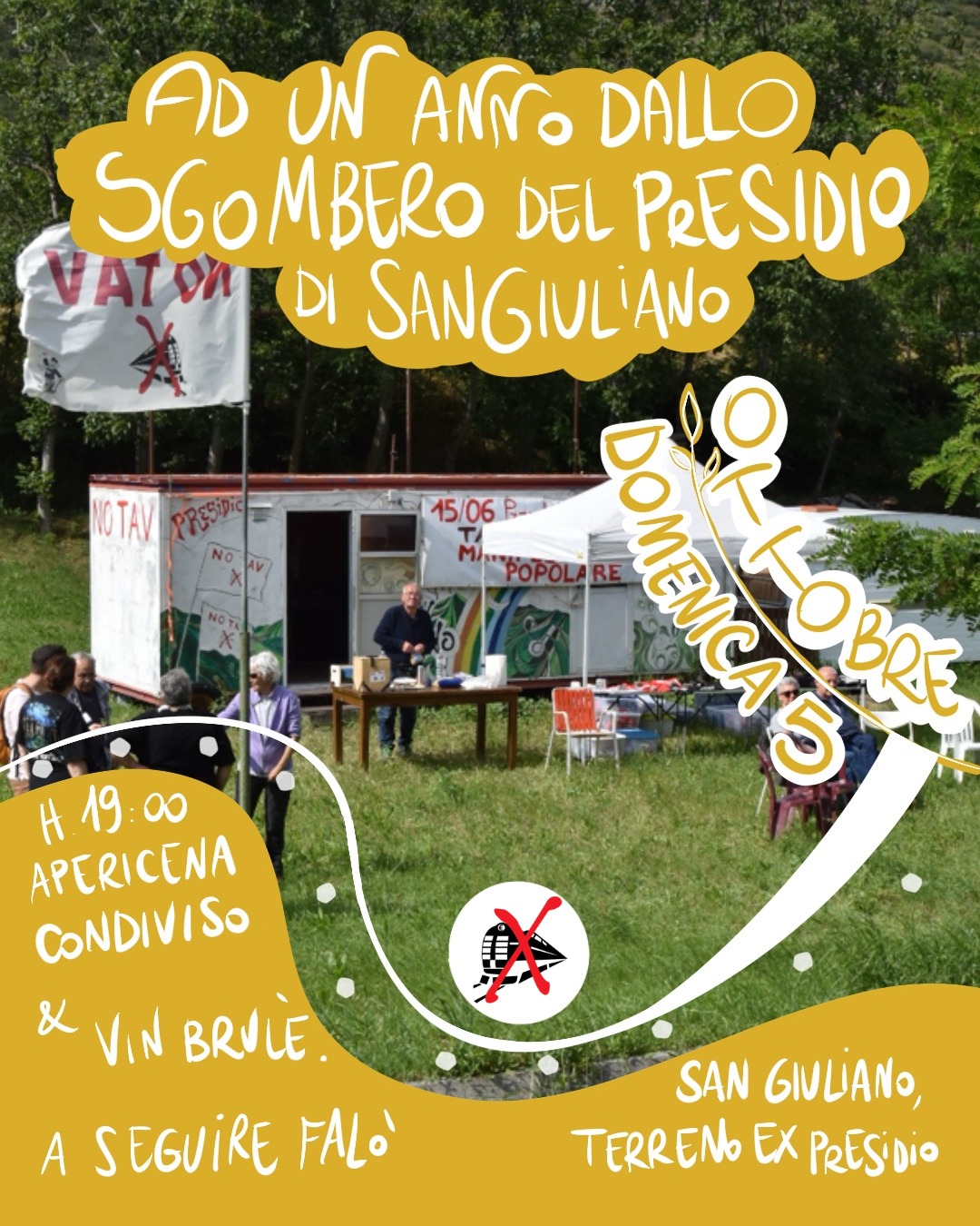 Ad un anno dallo sgombero violento del Presidio di San Giuliano, ritroviamoci su quei terreni che, negli anni, hanno segnato una tappa fondamentale per la lotta contro il treno ad Alta Velocità Torino – Lione!
