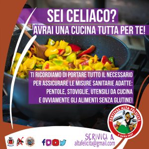 Vi ricordiamo di portare tutto il necessario per poter assicurare le misure sanitarie adatte. DA NON DIMENTICARE: pentole, piatto, posate e ovviamente prodotti senza glutine!