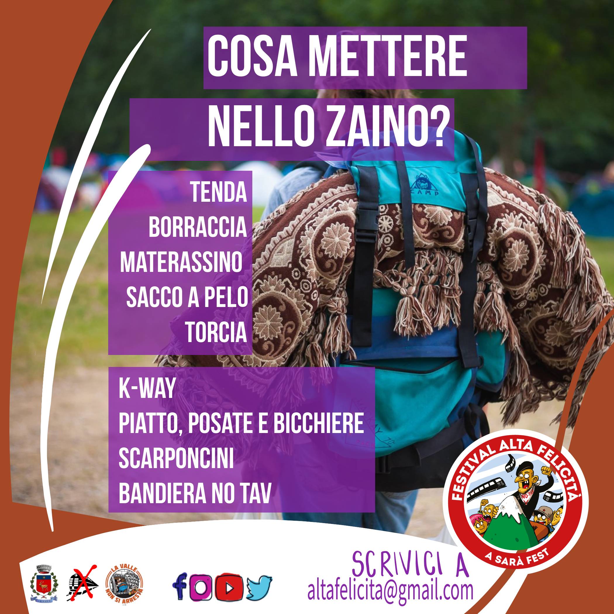 Se state invece pensando a cosa mettere nello zaino, vi aiutiamo noi! Non dimenticare che la Valsusa è una valle alpina quindi non dimenticatevi di mettere nello zaino l’indispensabile, per vivere al meglio questi tre giorni di campeggio.