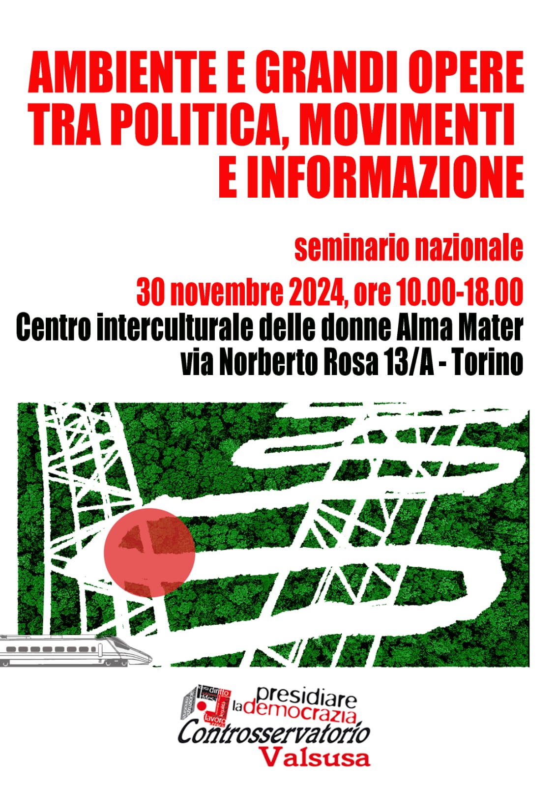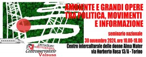 30 novembre 2024, ore 10,00-18,00: seminario nazionale “ambiente e grandi opere tra politica, movimenti e informazione”. Centro culturale delle donne Alma Mater (*), via Norberto Rosa 13/A – Torino.