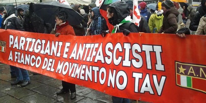 spezzone antifascista con striscione “Partigiani e Antifascisti a fianco del Movimento NO TAV” con bandiere e foulard partigiani