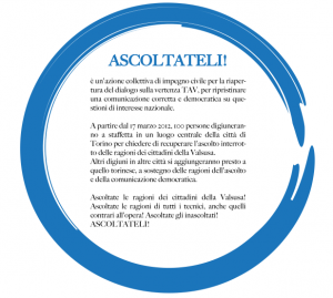 Ascoltateli! è un appello in favore di tutti e tutte coloro che hanno in vari modi chiesto di riconsiderare quest’opera nel quadro delle priorità italiane ed europee. È un appello, non solo per l’ascolto dei valsusini, ma di tutti gli esperti che hanno formulato critiche valide e che hanno il diritto di essere presi in considerazione. Ascoltateli! si riferisce alle ragioni che rischiano di non essere considerate. Ascoltateli! fa appello ai cittadini, ai politici, ma anche ai ricercatori italiani di Economia dei Trasporti, agli analisti economici e finanziari perché possa essere fatta luce sul valore reale del TAV in Val di Susa per l’economia del paese. L’appello si rivolge infine a coloro che nelle istituzioni hanno compiti decisionali e sono disponibili a un dialogo aperto, profondo, per giungere a una soluzione condivisa che tenga conto di tutti gli obiettivi legittimi di ciascuna parte in conflitto.