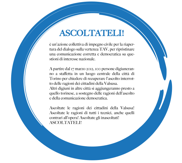 Il 17 marzo inizierà a Torino un digiuno pubblico a staffetta. Ascoltateli! chiede di aprire una discussione pubblica trasparente e approfondita, in primo luogo tecnica, condotta sotto lo sguardo attento della società civile, della rete e dei mass-media, a proposito del controverso progetto per la linea ad alta velocità in Val di Susa (TAV).