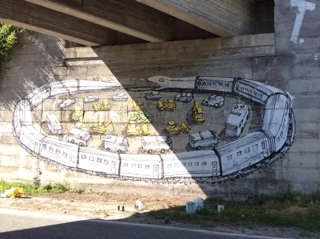 Sappiamo che un invito c’è stato ma non è questo l’importante, volgiamo ringraziare Blu a nome di tutti i notav per averci donato una sua opera sul nostro territorio. Il murales doveva essere fatto alla centrale di Chiomonte ma oggi le forze dell’ordine hanno impedito l’accesso all’area con mezzi blindati e reti perché il movimento aveva convocato una giornata intera di mobilitazione davanti ai cancelli.