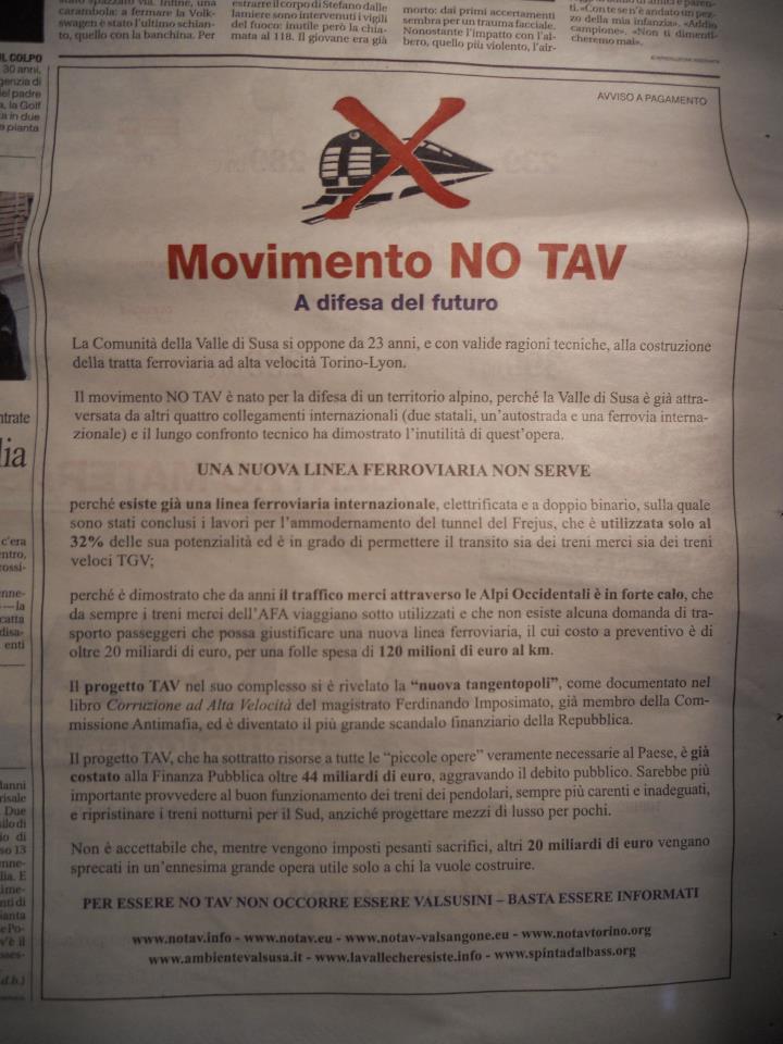 Venerdì 17 Repubblica ha ospititato una vera e propria pubblicità progresso, esponendo a pagamento un quarto di pagine sulle ragioni del movimento notav. La cosa ha detasto simpatia e ha lasciato sorpresi molti che poi capendo che lo spazio era stato pagato, han capito che tutto ha un prezzo anche Repubblica! Oggi allora, su La Stampa, con qualche giorno di ritardo rispetto al giorno della sfiga venerdì 17 (festa di Esposito), il super onorevole e il suo Portas-tutto si sono presi la briga di fare altrettanto, per paura che se in troppi leggono le ragioni del movimento notav ancora poi dicono: ma allora quel piciu perchè si scalda così tanto?