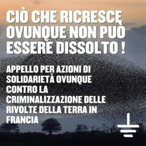 Per il governo francese, questa repressione e questa dissoluzione dovrebbero segnare l’arresto della crescente potenza di una rivolta logica per la riappropriazione delle nostre vite, la nostra terra e i beni comuni. E se questa dissoluzione diventasse, suo malgrado, una chiamata a rafforzare un grande movimento di resistenza internazionale ? Un invito a far risuonare la nostra solidarietà al di là delle frontiere, a dare nuovo adito alle numerose rivolte in tutto il mondo. Un invito a costruire nuove alleanze globali ’dal basso’, secondo la scala dei nostri corpi e dei nostri territori, in difesa della terra e della vita contro le predazioni capitaliste e imperialiste degli Stati-nazione e delle multinazionali.