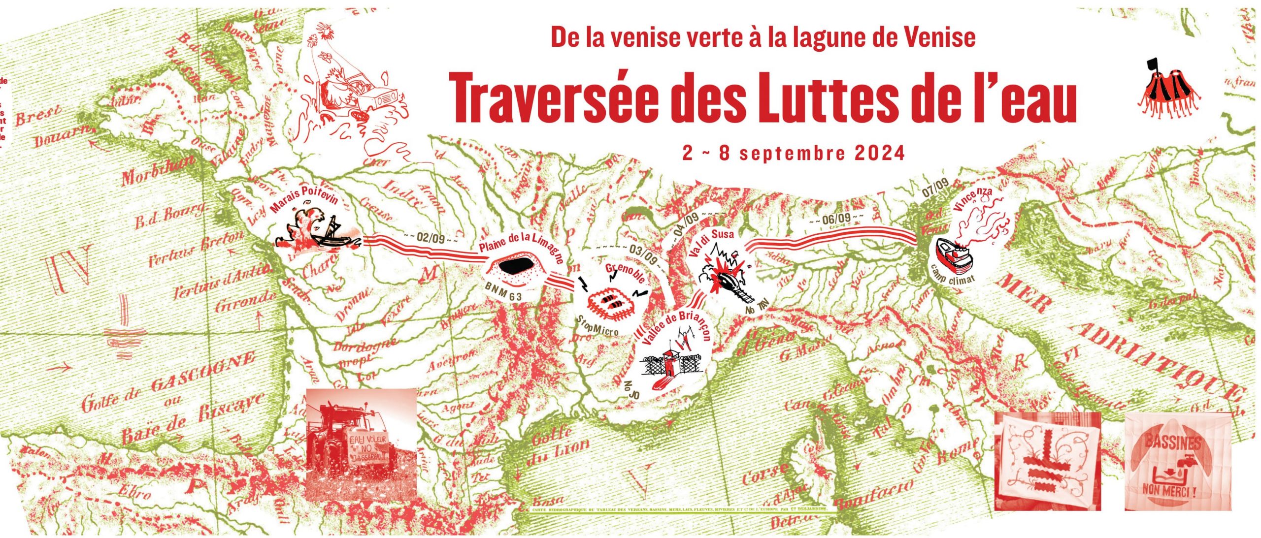 Il 2 settembre, su iniziativa del collettivo Bassines Non Merci e nell’ambito della stagione 7 di Soulèvements de La Terre, una delegazione partirà per una grande traversata dalla Venezia verde del Marais Poitevin a Vicenza, dove dal 5 all’8 settembre si svolgerà il Venice Climate Camp. L’obiettivo di questa traversata delle lotte per l’acqua, che riecheggia la Carovana zapatista per l’acqua e la vita del 2022, è quello di allertare l’opinione pubblica sui temi dell’accaparramento e dell’inquinamento dell’acqua, di rafforzare i legami tra i movimenti di resistenza popolare di fronte alla crescente violenza di Stato e di costruire un movimento di difesa dell’acqua al di là dei confini nazionali. Sono previste 5 tappe: a Limagne, Grenoble, sulle rive del lago di Serre-Ponçon, nella valle di Briançon e in Val di Susa. Giovedì 29 agosto, a partire dalle ore 19.00, si terrà una serata informativa presso il Consolato di Parigi (14 av. Parmentier).