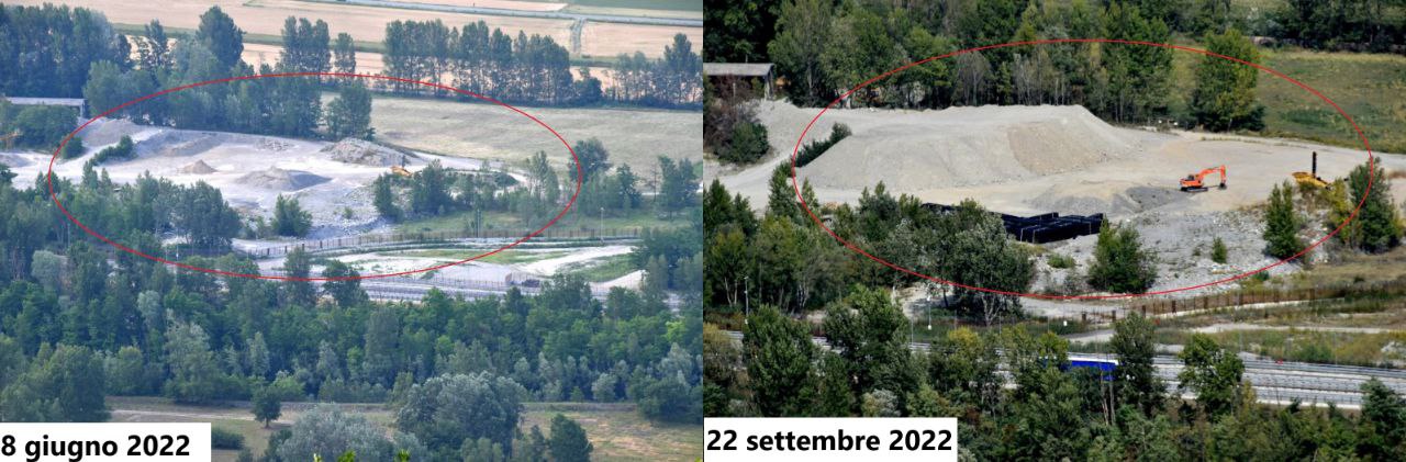 Queste due fotografie, scattate a distanza di pochi mesi, ci raccontano molto bene il progredire delle operazioni di stoccaggio di terre di scavo. Ci troviamo nella cava Eslo Silos, contigua al fortino di San Didero, dove dai progetti si vorrebbe ricollocare l’autoporto di Susa.
