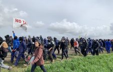 C’era anche una piccola delegazione NO TAV, ieri a Sainte Soline, insieme ai 30.000 che hanno partecipato il grande corteo contro i mega-bacini sostenuta dai Sollevamenti della terra. I mega-bacini sono infrastrutture di accumulo idrico che servono a stoccare in superficie acqua pompata dalle falde durante l’inverno al fine di renderla disponibile in estate a pochi grandi agricoltori impegnati a mantenere colture intensive e idrovore. In Italia come in Francia, mentre il cambiamento climatico avanza, invece di smetterla col consumo di suolo e adattarsi, una piccola minoranza di aziende agricole pensa di poter continuare con modelli agricoli ormai condannati grazie a questi escamotage. Grandi come 7 campi di calcio, impermeabilizzate con materiale plastico, i mega-bacini sono, nei fatti, un ennesimo strumento per privatizzare una risorsa comune come l’acqua a profitto di pochi, con effetti devastanti su fauna e flora nonché sulla maggior parte dei contadini.