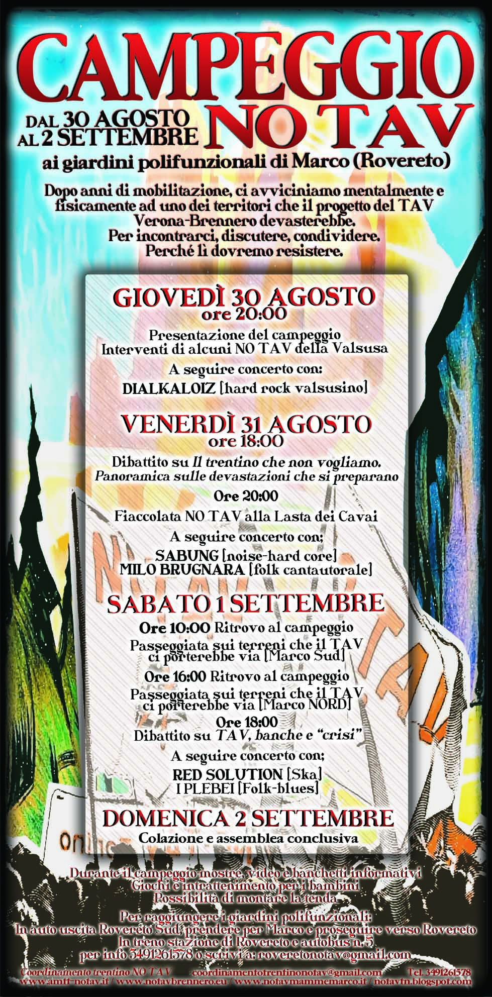 Un piccolo resoconto della giornata di venerdì al campeggio, dove lo spirito di collaborazione si è presto diffuso fra i campeggiatori per fronteggiare vento e pioggia e preparare le coperture dove mangiare e discutere “all’asciutto”. Alle sette Stefano Mayr ci ha presentato una riflessione accompagnata da immagini suggestive del Trentino che non vogliamo: fra i tunnel del Tav, Metroland, Pirubì, e bretelle di Nago, con acque compromesse da discariche abusive e terreni inquinati dall’industria mai bonificati, depredate per innevare artificialmente monti deturpati da tapiroulan e funivie per sciare dove oramai non nevica più. Circa 150 persone venute per discutere e partecipare che hanno dovuto però rinunciare alla fiaccolata a causa della pioggia. Dpo la suggestiva presentazione abbiamo mangiato insieme un ottima cena: orzetto, polenta, formaggio, insalata di patate, e tante ottime pizze sfornate al momento dagli amici piemontesi. Rifocillati e sotto i raggi di una luna che finalmente si è fatta vedere abbiamo ascoltato il Folk trentino di Milo Brugnara e il Noise dei Sabung. Per concludere danze con Dj Topolone.