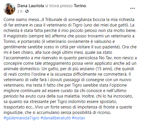 Una nuova trovata punitiva da parte del Magistrato di Sorveglianza di Dana che non le ha concesso la possibilità di far visitare il suo gatto dal veterinario di fiducia, chissà forse perché Valsusino. Condividiamo quindi le parole di Dana pubblicate in un post sul suo profilo facebook.