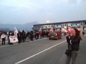 Due anni di carcere per aver parlato al megafono in un “parablocco” autostradale (che non era propriamente un blocco, si erano aperte le sbarre dei caselli, “Oggi paga Monti” era lo slogan della giornata), 10 minuti, settecento euro di danni all’autostrada… in totale 18 anni di condanne affibbiate a compagnx.