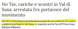 Il 9 settembre il tribunale di Torino nega le pene alternative all’attivista No Tav Dana Lauriola rendendo cogente la condanna a due anni di carcere per avere usato un megafono durante un blocco autostradale di alcuni minuti, nel 2012. Per la stessa manifestazione fu condannata e in seguito incarcerata Nicoletta Dosio, colpevole di aver retto uno striscione. A partire dalla sentenza, il movimento organizza sotto casa di Dana un presidio che viene sgombrato senza risparmio di manganelli al momento dell’arresto, all’alba del 17 settembre. Il madrigale dei media mainstream non si fa attendere. Il Fatto Quotidiano, giornale di Marco Travaglio (invitato a una delle ultime edizioni di Alta Felicità), titola: «No Tav, arrestati la portavoce Dana Lauriola e l’ex terrorista di Prima Linea Stefano Milanesi», inaugurando il festival degli accostamenti spericolati, che culmina con un sottotitolo de La Stampa «L’ex terrorista Dana Lauriola»: un falso clamoroso degno di querela.