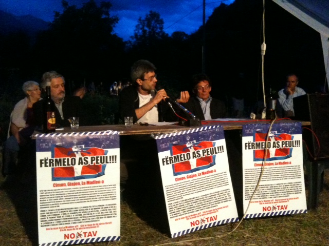 … vorrei dire giusto due cose sul senso della serata, perchè l’abbiamo costruita in questo modo e su ciò di cui vogliamo discutere insieme. Partiamo da una constatazione a partire dalla giornata importantissima del tre luglio: la lotta NoTav è entrata in una nuova fase per due ordini di motivi fondamentalmente. Uno ce lo abbiamo alla spalle qui: è l’inizio della militarizzazione della valle. Ma non è di questo che vogliamo parlare questa sera anche se va detto che molti di noi si sono mobilitati o hanno desiderato il ritiro degli alpini dall’Afghanistan: qui non abbiamo nè il ritiro degli alpini dall’Afghanistan che continuano a fare lì il loro sporco lavoro e adesso li abbiamo anche qui che iniziano a fare in maniera differente il loro sporco lavoro…