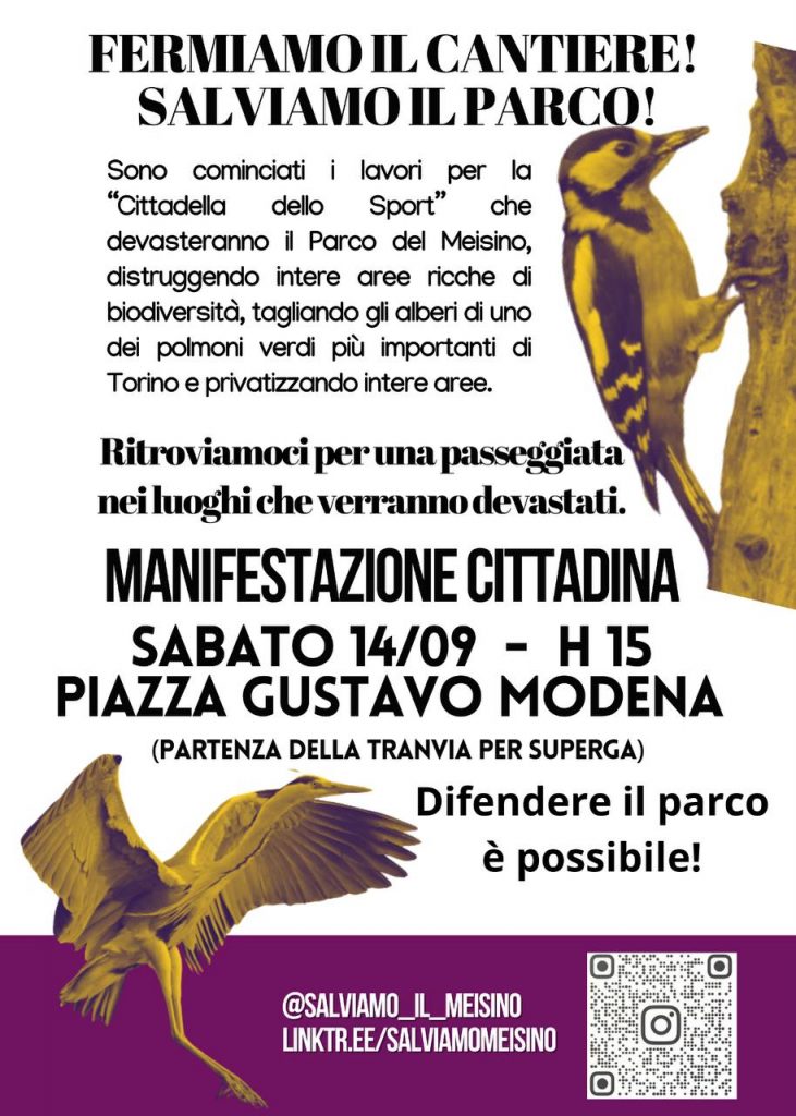 Il parco del Meisino è oggi nell’occhio del ciclone: sta a noi difenderlo e impedire che i lavori di devastazione vadano avanti indisturbati.