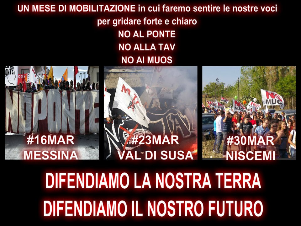 Un mese di mobilitazione in cui faremo sentire le nostre voci all’unisono, in cui ricorderemo nuovamente che le lotte contro il ponte sullo stretto, contro il TAV in Val di Susa, e contro il MUOS in Sicilia si intrecciano naturalmente in un’unica battaglia per la difesa dei beni comuni. Diverse sono le specificità delle nostre lotte ma un filo rosso le unisce nei comuni obiettivi di fondo e nelle forme di una protesta la cui forza è continuamente alimentata da un’ampia partecipazione popolare.