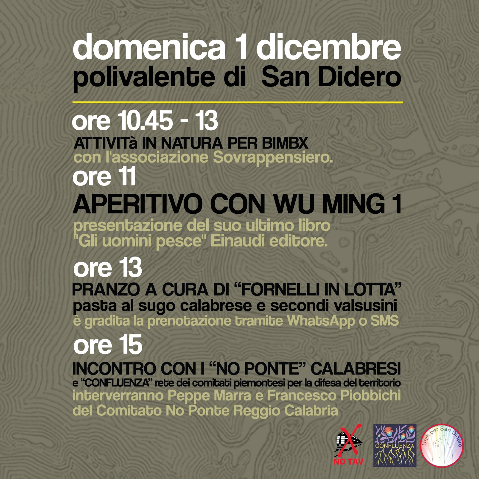 Fare rete è uno degli strumenti più preziosi che abbiamo tra le mani per contrastare una gestione forsennata dei nostri territori. Ed è per questo che domenica 1 dicembre, al Polivalente di San Didero, incontreremo il comitato No Ponte (che ci raggiungerà in Valsusa dalla Calabria) e “Confluenza” la rete dei comitati piemontesi per la difesa del territorio. Sarà l’occasione per aggiornarci reciprocamente, discutere insieme e condividere percorsi di lotta e contrapposizione in un’ottica di unione di percorsi per la salvaguardia dell’ambiente che ci circonda.