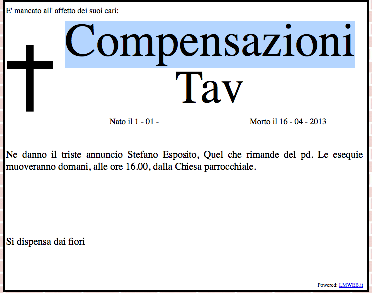 Otto su dieci milioni di euro destinati alle compensazioni per il Tav sono stati dirottati altrove. Nè da il triste annuncio la Gazzetta Ufficiale con data del 16 aprile scorso. Piangono Stefano Esposito e quello che rimane del Pd.