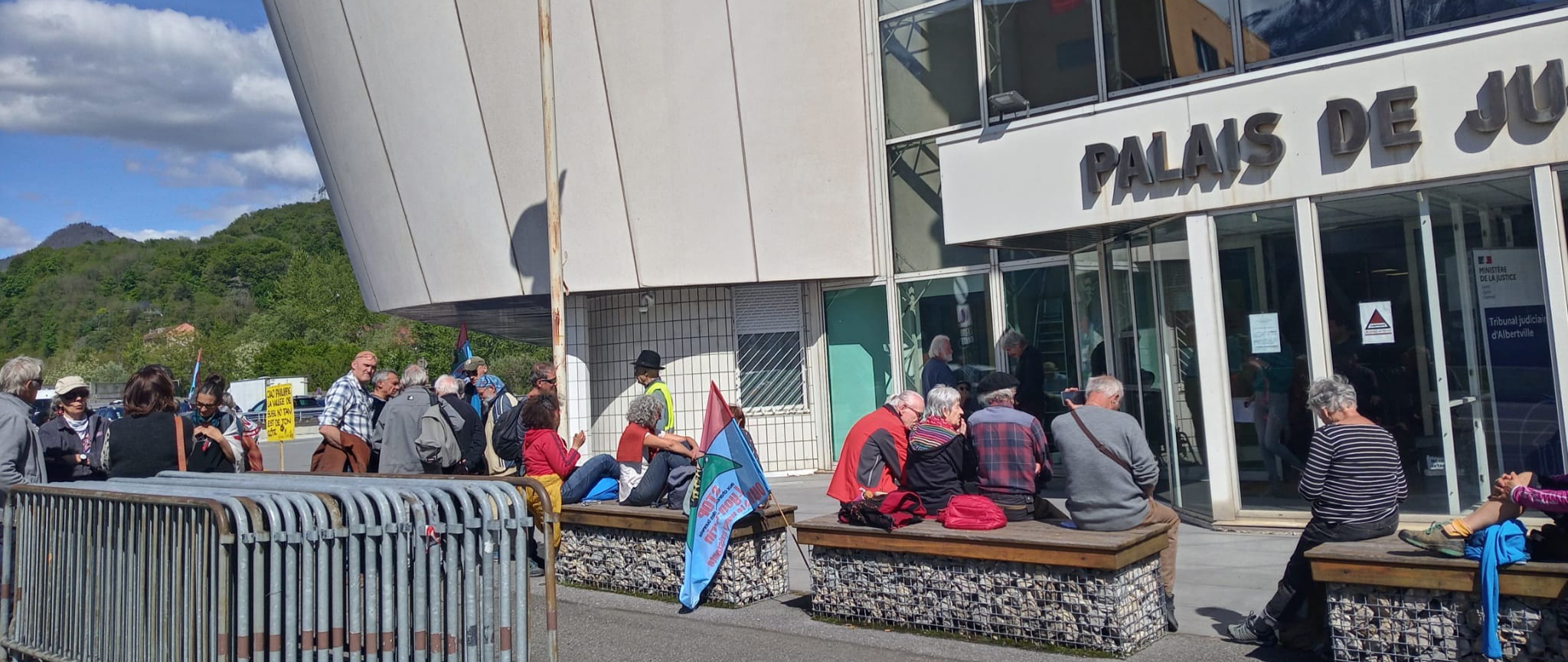 Sempre più determinati, eravamo numerosi dalla Francia e dall’Italia davanti al tribunale per riaffermare il nostro sostegno di fronte alle intimidazioni di TELT e alla repressione giudiziaria, ed assistere -ancora una volta- insieme alla sua sconfitta. Prima dell’udienza, all’esterno del tribunale, ci sono stati alcuni interventi, tra cui quello di Philippe. Era presenti un centinaio di persone, i numerosi comitati locali contro il progetto ecocida della seconda linea Lyon Turin (VAM (Vivre et Agir en Maurienne), BASV (Belledonne a Sa’Voix), la decina di CCLT (Collectifs Contre le Lyon Turin 2)), l’associazione “Les Amis de la Terre” e il deputato Jean-Francois Coulomme. Tra bandiere, cartelloni e canti, si respirava un’atmosfera solidale e potente.