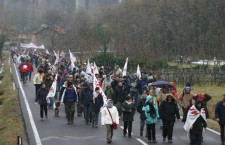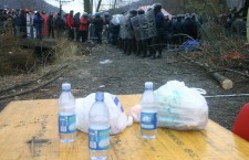 Dal furgone si continua a spiegare la situazione, “oggi siamo noi a provare a passare i blocchi, abbiamo anche noi gli scudi, spingeremo verso Venaus!”, l’intervento è accolto da applausi e grida d’incitamento, inizia la contesa, passa il container e la polizia si schiera compatta a chiudere il varco, le arieti no tav ci provano e si comincia a spingere, il contatto è determinato, la polizia carica ma non riesce ad andare oltre pochi centimetri dalla propria postazione, calci e manganelli colpiscono gli scudi e chi ne rimane fuori. Nicoletta Dosio è colpita in pieno volto da una manganellata che gli rompe il naso, la professoressa sanguina vistosamente, il corteo spinge e risponde alle cariche, volano oggetti ed è naturale che sia così. I compagni della fila di scudi sono circondati da gente che non si tira indietro, molti sono di Venaus, tutti sono lì per provarci. Non si indietreggia , la massa spinge e la colluttazione dura diversi minuti. Dalle curve sopra le collinette si scattano foto e si fanno riprese, ma soprattutto si incita a non mollare l’azione, dalla casa accanto al blocco vola qualche vaso di terracotta all’indirizzo della polizia, un anziano no tav colpisce un poliziotto con l’ombrello. E’ il momento, il corteo si divide, una parte prosegue in su verso Giaglione e si riversa giù dalla montagna per i sentieri. Tutti i punti sono buoni, inizia a nevicare quasi a rendere la coreografia della giornata di resistenza alpina perfetta, al bivio dei Passeggeri continua il fronteggiamento ma inizia a filtrare gente dai lati dello schieramento delle forze dell’ordine che ormai allo sbaraglio si aprono sconfitte. Sono migliaia i no tav che sono già al cantiere, l’area è recintata a ferro di cavallo, il prato su cui si sono costruiti i giorni meravigliosi di resistenza sono circondati da quella rete rossa che vilmente i tecnici di CMC, passamontagna calato sul volto, protetti dalla polizia, hanno piantato nel terreno durante la notte del blitz. I manifestanti si dispongono tutt’intorno alla rete, a guardar bene sembra quasi che si aspetti il segnale del via. La discesa sotto gli osceni piloni dell’autostrada, già vergati a vernice con due scritte no tav enormi, è composta da una cascata colorata di no tav, da Giaglione scendono i furgoni e il resto della manifestazione che passa vicino alla chiesa di Venaus le cui campane, ancora una volta, scandiscono i rintocchi della lotta.