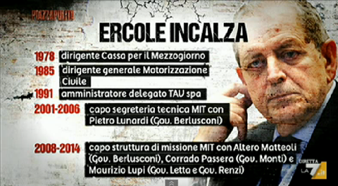 Ma ci vorrà l’arrivo in piazza della Croce rossa del «federale della Maremma», Altero Matteoli [oggi definitivamente sdoganato dal Cavaliere in chiave anti Fini] perché Ercole Incalza torni al vertice del ministero delle infrastrutture e dei trasporti e faccia incetta degli incarichi più rilevanti, e addirittura assuma direttamente la responsabilità di scegliere le opere da inserire nella «legge Obiettivo» e di tutto quanto c’è di più delicato proprio in materia di appalti.