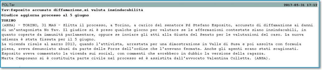 Esposito fu denunciato per diffamazione per queste affermazioni e con tutta la calma del caso (quando non si tratta dei notav), gli è stata fissata per lunedì 5 Giugno alle ore 12 in aula 84 l’udienza per decidere se rinviarlo a giudizio.