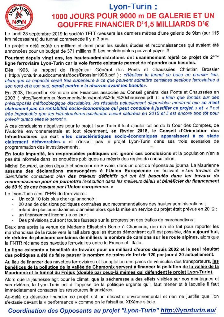 A due anni dalla venuta di Elisabeth Borne a Chamonix nulla è stato fatto per portate le merci dalla gomma al ferro mentre gli studi dimostrano che è possibile, già da oggi, ridurre di centinaia di migliaia di unità il numero di camion sulle strade alpine, mentre la Federazione nazionale dei trasporti (FNTR) chiede delle navette ferroviarie tra la Francia e l’Italia. La linea esistente dal 2002 ha beneficiato di lavori per un miliardo di euro e il solo risultato di queste politiche è stato di far passare il numero di treni merci dai 120 di allora ai 20 di oggi. Invece di finanziare le navette ferroviarie et l’adattamento del parco veicoli degli autotrasportatori, il miglioramento delle qualità dell’aria della valle di Chamonix serve a finanziare un maggiore inquinamento della Valle della Maurienne e il raddoppio del tunnel del Frejus (promosso dagli stessi che spingono il progetto Torino-Lione).