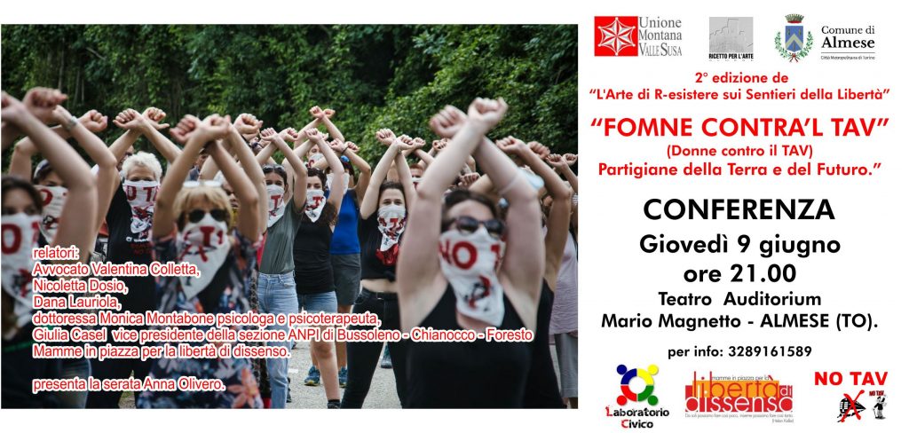 Giovedì 9 giugno, alle ore 21, al Teatro Auditorium Mario Magnetto di Almese, si terrà la conferenza “FOMNE CONTRA’L TAV (Donne contro il TAV) Partigiane della Terra e del Futuro”.