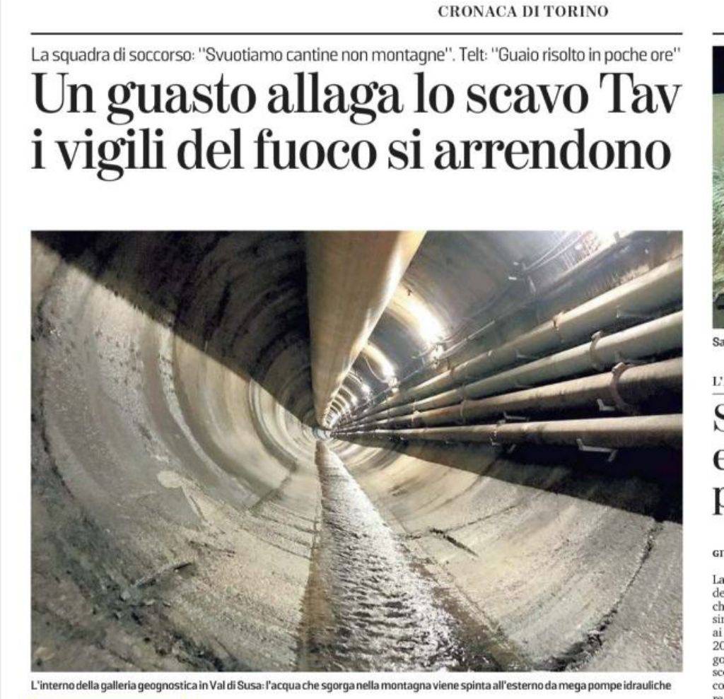 Nel mentre nei meandri del tunnel geognostico di Chiomonte, gli addetti ai controlli, notavano un rivolo di acqua che in pochi secondi è diventato un bel ruscello che velocissimo ha allagato i 7 km di lavori fin’ora svolti. Così hanno chiamato i Pompieri che in tutta risposta gli hanno detto “siamo attrezzati per svuotare cantine e non montagne”.