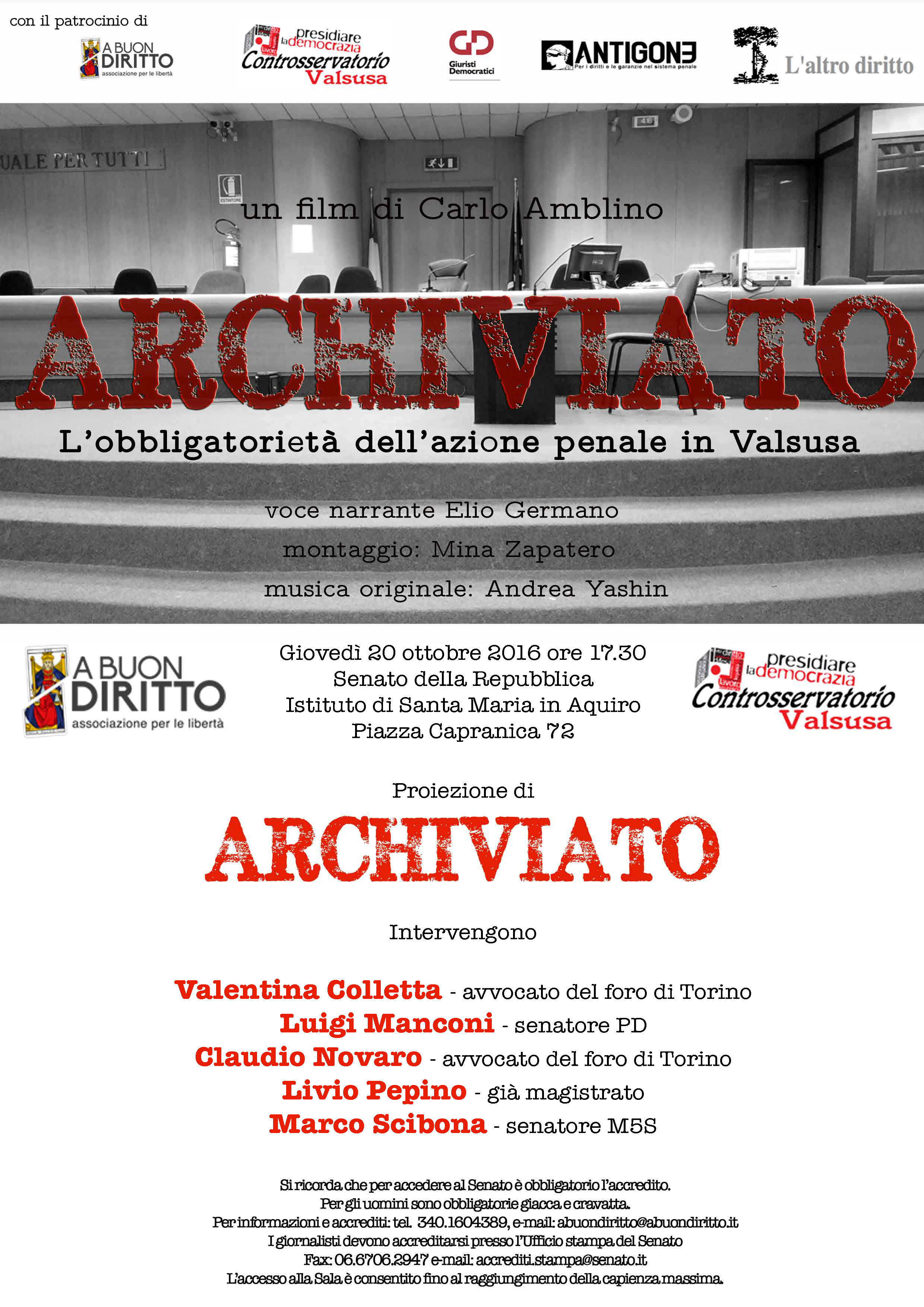 Il documentario “ARCHIVIATO. L’obbligatorietà dell’azione penale in Valsusa” affronta dunque il delicato tema della tutela giudiziaria delle persone offese dai reati commessi dagli agenti e dai funzionari appartenenti alle varie forze dell’ordine e per farlo si avvale di immagini e documenti, per lo più inediti.