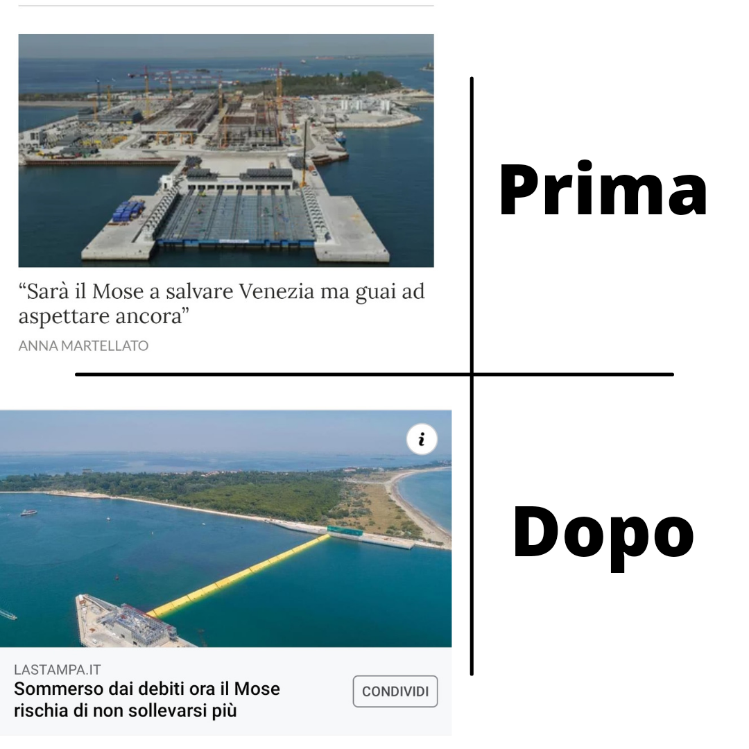 Chi dice non c’è alternativa, bisogna correre, chi vuole la crescita ad ogni costo (umano e naturale) deve essere fermato. Le alternative nel caso del MOSE, come nel caso del Tav (cioè l’adeguamento della linea storica) esistono eccome, ma è stata scelta la via più impattante, più dispendiosa, meno efficace per un semplice motivo: per riempire le tasche dei soliti noti. Adesso che quel mostro ecologico non è ancora entrato in funzione del tutto e già si sa che marcirà inutilizzato tra la salsedine, mentre Venezia è messa sempre più in pericolo dal cambiamento climatico, adesso si piangono lacrime di coccodrillo.