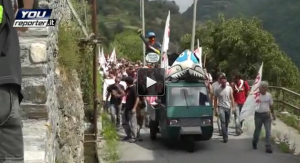 Il percorso si fa duro, dopo un primo tratto pianeggiante sulla strada agricola che dall’abitato di Giaglione attraversa la frazione San Giovanni, il movimento no tav si arrampica sui sentieri del Clarea. Ancora una volta ci si scontra con le limitazioni della prefettura che nulla possono però contro la conoscenza dei sentieri e le mille vie che attraverso i boschi consentono di raggiungere la val Clarea. Così giovani e meno giovani si aiutano nei guadi e nelle salite in una splendida giornata di sole e lotta.