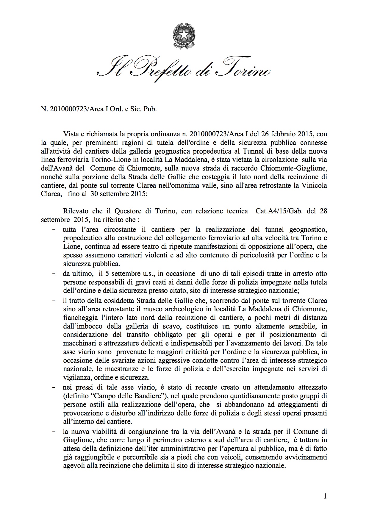 Il 30 settembre scorso è scaduta l’ordinanza prefettizia n.2010000723 emanata nel febbraio 2015 e nello stesso giorno il prefetto Basilone ha emanato una nuova ordinanza, manco fossimo ai tempi degli editti reali, in cui si conferma sostanzialmente la gestione della “zona rossa” attorno al cantiere tav di Chiomonte.