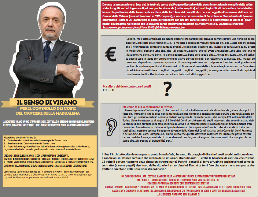 crediamo che con quegli incarichi ..e con le remunerazioni conseguenti… dovrebbe almeno esercitare un controllo costante sui costi, proprio a partire da quelli relativi alle opere minori perché se non si è in grado di controllare i milioni di euro adesso come si può pensare di controllare i miliardi di euro che scorreranno se mai si realizzasse la Torino Lione?