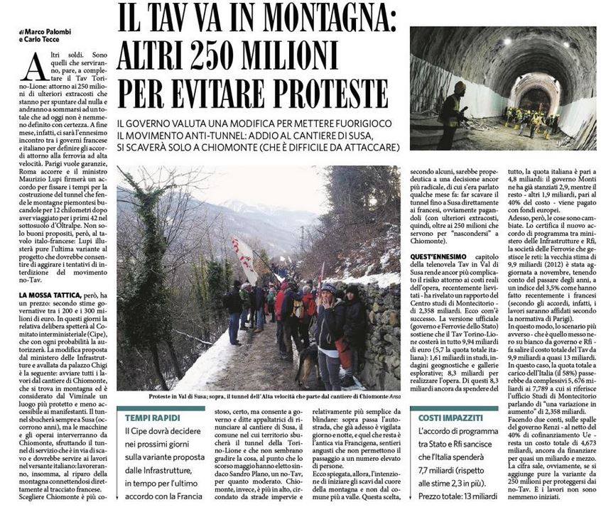Altri soldi. Sono quelli che serviranno, pare, a completare il Tav Torino-Lione: attorno ai 250 milioni di ulteriori extracosti che stanno per spuntare dal nulla e andranno a sommarsi ad un totale che ad oggi non è nemmeno definito con certezza. A fine mese, infatti, ci sarà l’ennesimo incontro tra i governi francese e italiano per definire gli accordi attorno alla ferrovia ad alta velocità. Parigi vuole garanzie, Roma accorre e il ministro Maurizio Lupi firmerà un accordo per fissare i tempi per la costruzione del tunnel che fende le montagne piemontesi bucandole per 12 chilometri dopo aver viaggiato per i primi 42 nel sottosuolo d’Oltralpe. Non solo buoni propositi, però, al tavolo italo-francese: Lupi illusterà pure l’ultima variante al progetto che dovrebbe consentire di aggirare i tentativi di interdizione del movimento no-Tav. LA MOSSA TATTICA, però, ha un prezzo: secondo stime governative tra i 200 e i 300 milioni di euro. In questi giorni la relativa delibera spetterà al Comitato interministeriale (Cipe), che con ogni probabilità la autorizzerà. La modifica proposta dal ministero delle Infrastrutture e avallata da palazzo Chigi è la seguente: avviare tutti i lavori dal cantiere di Chiomonte, che si trova in montagna ed è considerato dal Viminale un luogo più protetto e meno accessibile ai manifestanti. Il tunnel sbucherà sempre a Susa (occorrono anni), ma le macchine e gli operai interverranno da Chiomonte, sfruttando il tunnel di servizio che è in via di scavo e dovrebbe servire ai lavori nel versante italiano: lavoreranno, insomma, al riparo della montagna connettendosi direttamente al tracciato francese. Scegliere Chiomonte è più costoso, certo, ma consente a governo e ditte appaltatrici di rinunciare al cantiere di Susa, il comune nel cui territorio sbucherà il tunnel della Torino-Lione e che non sembrano gradire la cosa, al punto che lo scorso maggio hanno eletto sindaco Sandro Plano, un no-Tav, per quanto moderato. Chiomonte, invece, è più in alto, circondato da strade impervie e relativamente più semplice da blindare: sopra passa l’auto – strada, che già adesso è vigilata giorno e notte, e quel che resta è l’antica via Francigena, sentieri angusti che non permettono il passaggio a un numero elevato di persone. Ecco spiegata, allora, l’intenzio – ne di iniziare gli scavi dal cuore della montagna e non dal comune più a valle. Questa scelta, secondo alcuni, sarebbe propedeutica a una decisione ancor più radicale, di cui s’era parlato qualche mese fa: far scavare il tunnel fino a Susa direttamente ai francesi, ovviamente pagandoli (con ulteriori extracosti, quindi, oltre ai 250 milioni che servono per “nascondersi” a Chiomonte).