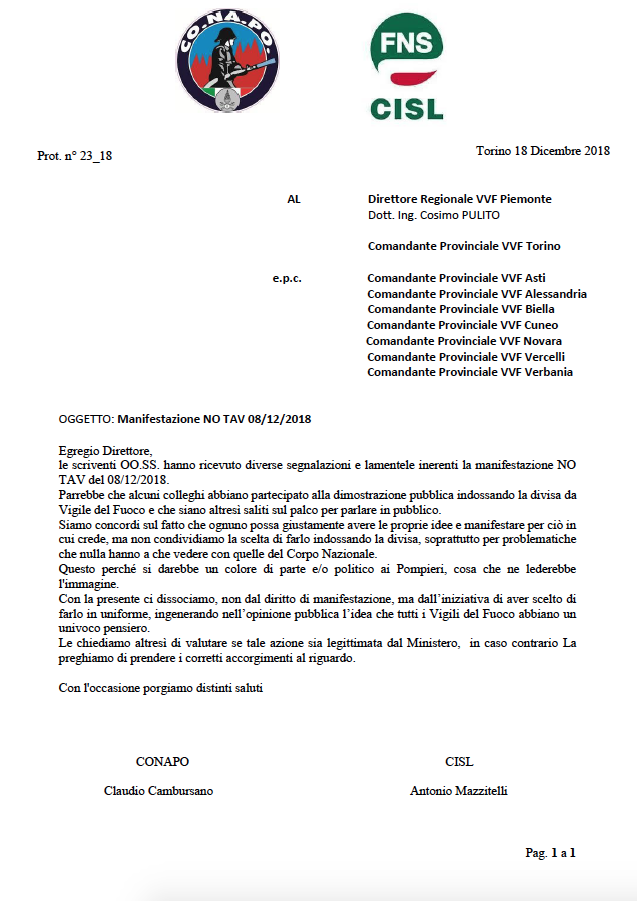 E invece con grande sdegno e stupore scopro che a promuovere l’azione disciplinare verso coloro che hanno “osato” sfilare e salire sul palco della manifestazione No-Tav sono dei colleghi lavoratori e udite udite anche sindacalisti CISL e CONAPO.