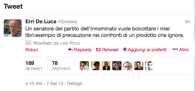 Pubblichiamo qui di seguito un’articolo dell’Huff Post che ha raccolto le prime testimonianze di solidarietà con Erri De Luca, contro il quale, dopo l’appoggio pubblico dato alla lotta notav e alle sue forme, è stata lanciata una campagna di sabotaggio a partire dal deputato del pdl Giuseppe Esposito (il cognome denota una somiglianza con l’altro Espochi? e li accomuna anche la quantità di libri letti dai due:) ).