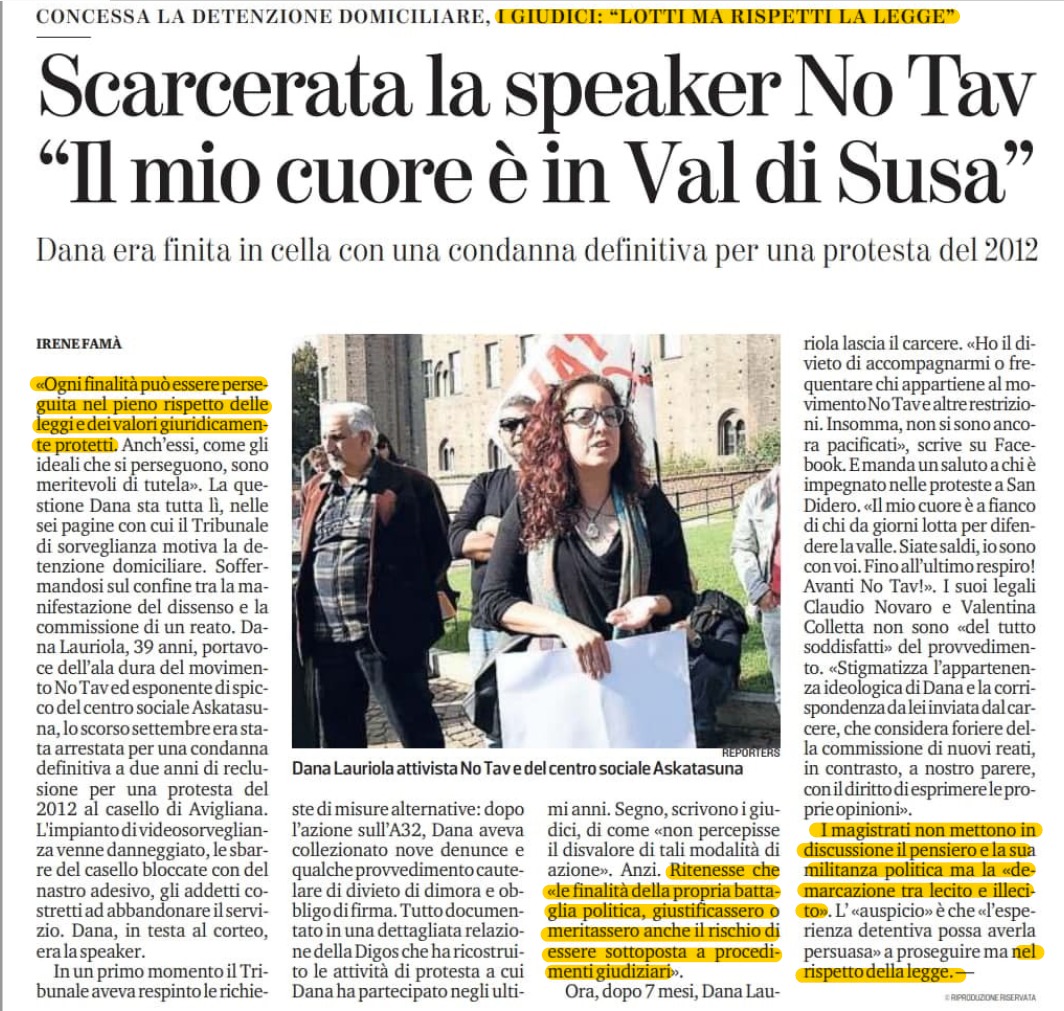 I giudici dicono a Dana e a tutti i NO TAV: Lottate, ma nel rispetto della legge.