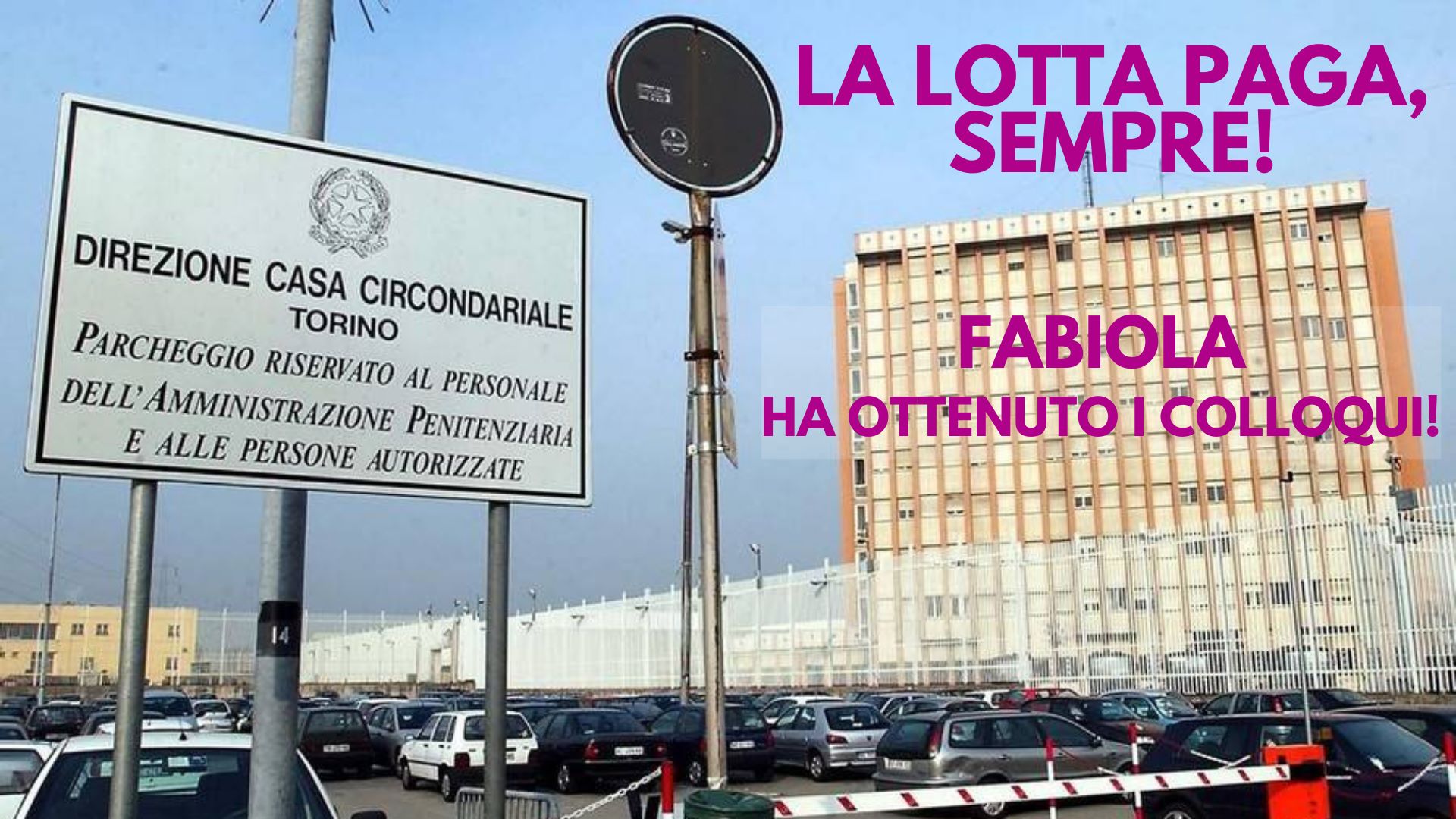 Dopo sei giorni di sciopero della fame la direzione del carcere delle Vallette di Torino ha finalmente firmato le autorizzazioni a Fabiola per i colloqui con il suo compagno.