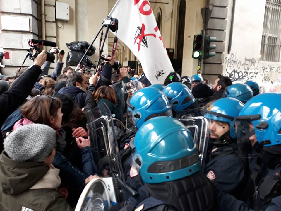 Questa mattina studenti e No Tav sono stati più volte caricati e respinti dalla polizia nel tentativo di accedere all’Aula Magna della Cavallerizza, dove era ospitato il convegno “Il dibattito pubblico per le opere condivise”. Un grande appuntamento per imprese e “professionisti del settore”, facile passerella per politici speranzosi di essere rieletti ed ennesimo tentativo dell’Università di accreditarsi in quei giri che “contano”.