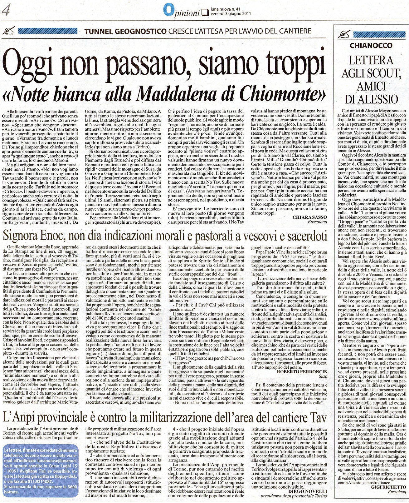 Pubblichiamo una interessante pagina di lettere e opinioni dalla val di Susa. Sono pubblicate sul settimanale di informazione locale Luna Nuova ed ormai dominano come argomento (quello appunto della tav) il dibattito politico-sociale valsusino. Questo settimanale ha poi avuto negli anni un incremento della diffusione diventando il primo in tiratura nella provincia di Torino proprio grazie allo spazio e alla libertà con la quale la sua redazione e i lettori si sono dedicati ai temi sociali come questo per l’appunto. Per chi seguisse dall’esterno questo movimento leggere queste righe è un modo per capirne la complessità e la pluralità oltre che la dimensione di massa che da sempre lo contraddistingue.