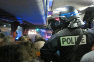Mentre eravamo chiusi in gabbia nella piazza dove si svolgeva l’evento, si è avvicinato a noi un ragazzo francese giovanissimo e minuto, che mi ha narrato la sua storia delle ultime ore. Giunto a Lyon la sera precedente il lunedì 3 dicembre con altri amici per partecipare alle manifestazioni in programma, mentre stavano cenando in gruppo in un ristorante, hanno sentito battere ai vetri. Guardando fuori hanno intravisto dei poliziotti, che subito dopo sono entrati e hanno gettato un lacrimogeno, intossicando loro e il cameriere che li serviva.