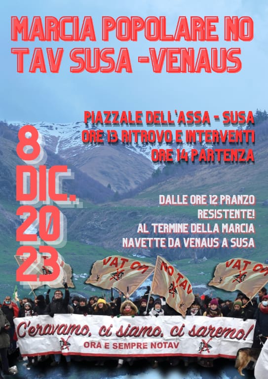 L’invito per tutt* per questo 8 dicembre è quello di raggiungere la Val di Susa, la Valle che resiste, per la grande marcia popolare da Susa a Venaus e per le tante altre iniziative che attraverseranno la nostra terra in quei giorni.