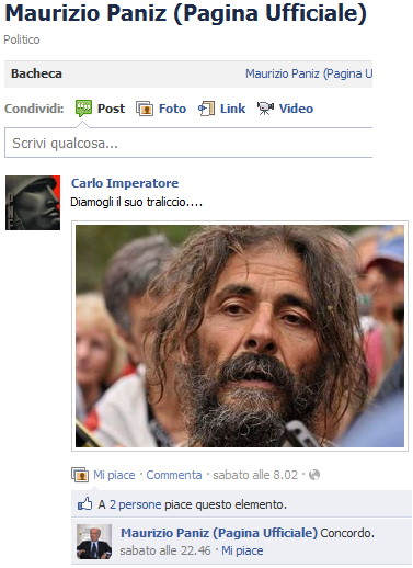 Un certo Carlo Imperatore – per intenderci, fan di Benito Mussolini – posta sulla pagina ufficiale dell’onorevole Pdl Maurizio Paniz una foto del no-tav Turi Vaccaro, scrivendo “diamogli il suo traliccio …”. Della serie, speriamo che finisca folgorato come l’altro. E sapete qual è stata la risposta di Paniz, il parlamentare della ammazza-processi, della chiusura di “vajont.info” e del “Ruby era davvero la nipote di Mubarak”? Si sarà dissociato, giusto? Sì, ecco qui la replica, secca: